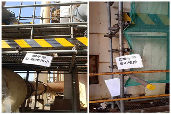 針對檢查發(fā)現(xiàn)的現(xiàn)場腳手架使用狀態(tài)信息無法識別,安全警示不到位的問題,公司領(lǐng)導(dǎo)高度重視,EHS部立即組織各檢修單位召開專題會,明確要求各單位進一步完善腳手架搭建驗收后的管理要求,對現(xiàn)場所有腳手架進行排查梳理,完善“搭建中、驗收合格可使用、暫不使用、待拆除”等各種狀態(tài)信息牌,確保高處作業(yè)風險可控、在控。