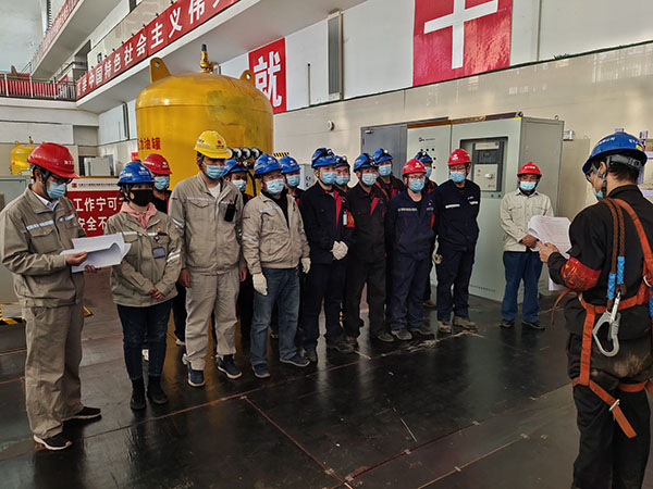 拆除工作開(kāi)始前,專業(yè)人員、檢修人員、監(jiān)理人員三方按照編制的專項(xiàng)吊裝方案認(rèn)真核對(duì)檢修措施,重點(diǎn)對(duì)主橋機(jī)供電系統(tǒng)、起升系統(tǒng)、吊具進(jìn)行檢查。同時(shí)組織工作負(fù)責(zé)人和工作班成員現(xiàn)場(chǎng)開(kāi)展三講一落實(shí)活動(dòng),著重對(duì)本次吊裝作業(yè)過(guò)程中存在的風(fēng)險(xiǎn)點(diǎn)和預(yù)控措施進(jìn)行現(xiàn)場(chǎng)講解。燈泡頭拆除過(guò)程中,由于尺寸原因泡頭與定子基座把合螺栓松開(kāi)后,未能按照預(yù)期直接放置到專用工具上。檢修指揮部現(xiàn)場(chǎng)研究方案,轉(zhuǎn)變思路,采用單側(cè)著力再逐步調(diào)整另一側(cè)的方案,把干涉區(qū)域盡量避開(kāi),整個(gè)拆除吊裝歷時(shí)5個(gè)小時(shí)順利完成。拆除吊運(yùn)期間,該公司各級(jí)人員到位監(jiān)督,有效保障了安全措施齊全可靠?,F(xiàn)場(chǎng)檢修人員充分發(fā)揚(yáng)團(tuán)結(jié)協(xié)作、不怕吃苦、奮勇拼搏的工作精神,本著精益求精的工作態(tài)度,嚴(yán)格執(zhí)行安全規(guī)程、檢修工藝和工序,確保了整個(gè)拆除工作萬(wàn)無(wú)一失。