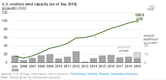 根據(jù)美國能源信息管理局(EIA)數(shù)據(jù),截至2019年9月,美國的陸上風(fēng)電累計裝機容量已超過100 GW,到2020年底可能達(dá)到122 GW。