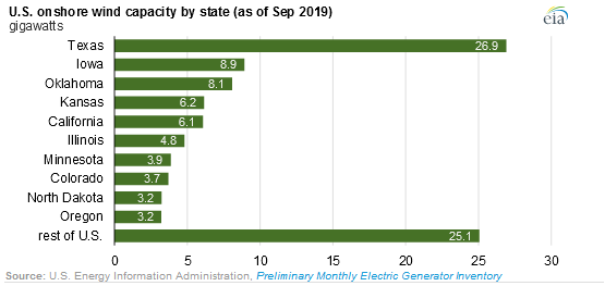 截至2019年第三季度,美國有41個州安裝了風(fēng)力渦輪機。德克薩斯州的裝機容量最大,為26.9吉瓦,其次是愛荷華州,俄克拉荷馬州和堪薩斯州。這四個州占美國總裝機容量的一半。