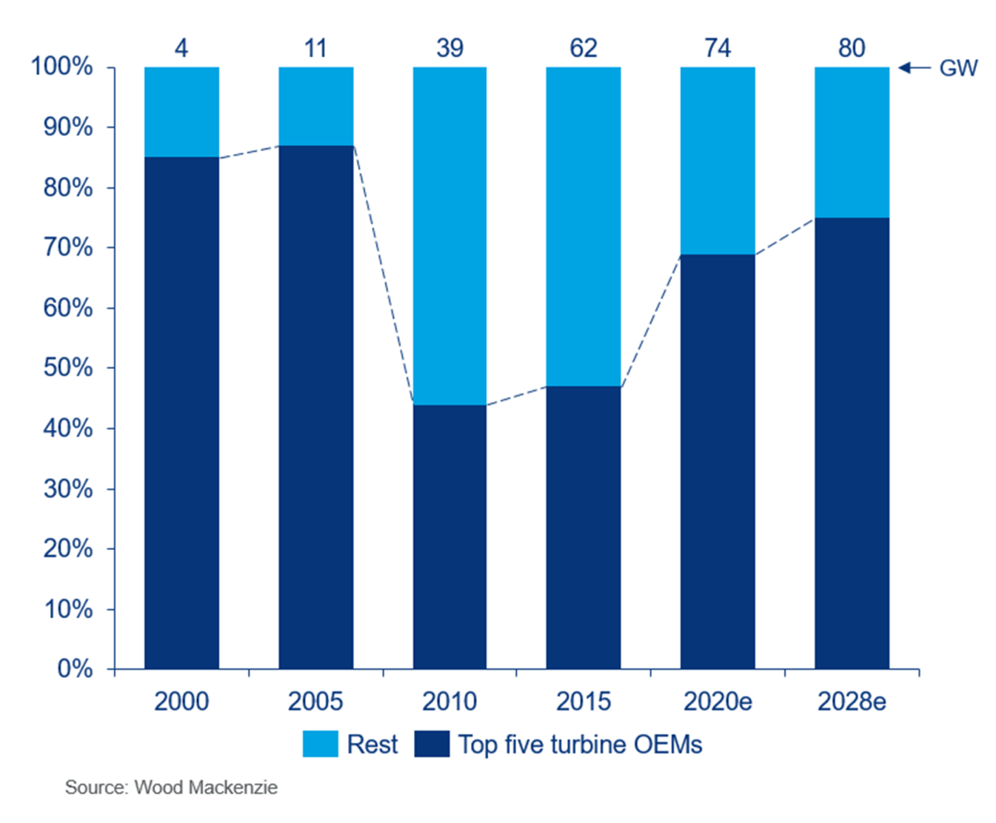 根據伍德·麥肯齊(Wood Mackenzie)的最新研究,到2028年,領先的三大風力渦輪機原始設備制造商的市場份額將從2019年的47%(即32GW)增長到60%以上(即48GW)。