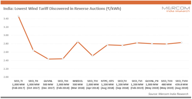 根據(jù)Mercom India Research的數(shù)據(jù),由于招標(biāo)不足,2019財(cái)年已招標(biāo)了超過(guò)5吉瓦的風(fēng)能項(xiàng)目,其中2019年迄今為止已拍賣了3吉瓦的風(fēng)能項(xiàng)目。2019年,平均風(fēng)電稅率為每千瓦時(shí)2.80盧比(約合0.039美元)。 Mercom去年報(bào)告稱,自電子逆向拍賣啟動(dòng)以來(lái),截至2018年12月,已拍賣了約9.5吉瓦的風(fēng)能項(xiàng)目。