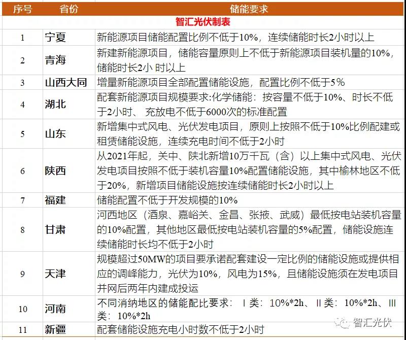 對于由電網(wǎng)承擔消納任務的保障性規(guī)模,部分省份也要求配一定能比例的儲能。根據(jù)各省的競爭性配置文件,大部分省份的保障性規(guī)模儲能配置要求為10%功率、2小時,如下表所示。