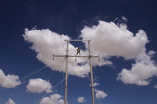 項目架空線路桿塔共計668基,12種桿塔型式。桿塔是在35kV架空線路架設,線路總長度約122.21km,塔高為15-21米,屬于高空作業(yè)。施工現(xiàn)場干旱炎熱,沙塵暴和冰雹也常常輪番“光顧”,給施工進度和安全管理帶來不小的挑戰(zhàn)。在桿塔組立作業(yè)前,項目部組織協(xié)作隊伍召開專題安全會,施工隊長徐少帥堅持對現(xiàn)場的施工操作人員進行詳細的安全、技術、質量交底工作;質量安全科林周彬堅持每天現(xiàn)場巡查,要求高空作業(yè)人員必須持證上崗,且具有合格的體檢報告;施工過程中,施工現(xiàn)場拉起安全警戒線、懸掛安全警示標識,安全員全程旁站監(jiān)督,確保現(xiàn)場施工安全質量可控。