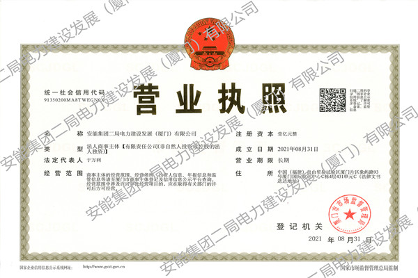 中國電力網(wǎng)訊 8月31日,中國安能第二工程局電力建設(shè)發(fā)展(廈門)有限公司順利完成工商登記并取得營業(yè)執(zhí)照。