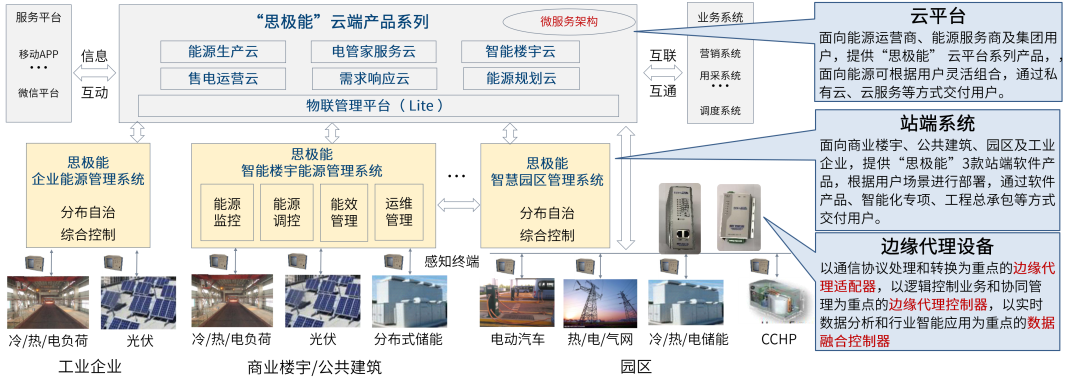國(guó)網(wǎng)信通產(chǎn)業(yè)集團(tuán)依托“云-網(wǎng)-邊-端-芯-智-鏈”的信息通信全產(chǎn)業(yè)鏈體系,開發(fā)以“思極能”品牌為核心的智慧能源服務(wù)軟硬件產(chǎn)品,滿足能源運(yùn)營(yíng)商/服務(wù)商、能源消費(fèi)者、能源產(chǎn)品商、政府等多元化用戶的綜合能源需求,打造智慧樓宇、智慧園區(qū)等典型CPS(信息物理系統(tǒng))場(chǎng)景的“智腦+神經(jīng)系統(tǒng)”,實(shí)現(xiàn)客戶側(cè)能源系統(tǒng)的安全、高效、低碳運(yùn)行。