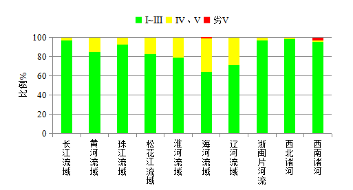 西北諸河、浙閩片河流、長江流域、西南諸河和珠江流域水質(zhì)為優(yōu),黃河、松花江和淮河流域水質(zhì)良好,遼河和海河流域?yàn)檩p度污染。