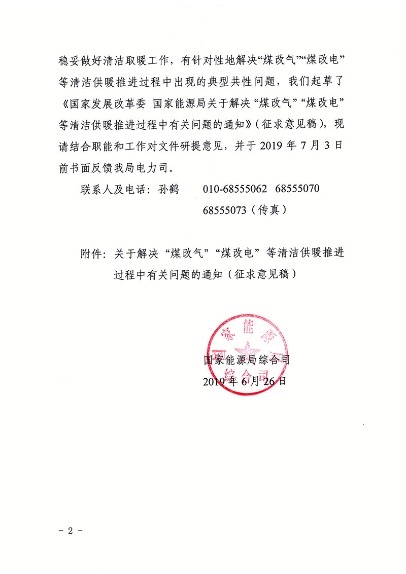 國家能源局綜合司征求《關(guān)于解決“煤改氣”“煤改電”等清潔供暖推進(jìn)過程中有關(guān)問題的通知》意見的函