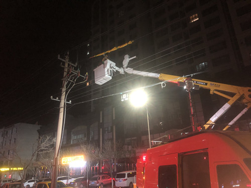 在應(yīng)急搶修燈的照明下,絕緣斗臂車(chē)絕緣臂緩緩升起,作業(yè)人員緩緩向作業(yè)點(diǎn)靠近,由于是夜間帶電搶修,作業(yè)能見(jiàn)度等條件較為不足,工作負(fù)責(zé)人不敢有一絲大意,嚴(yán)密監(jiān)護(hù)作業(yè)人員的行為。兩名帶電作業(yè)操作人員站在10多米高空的作業(yè)斗內(nèi),小心翼翼的包絕緣毯,套絕緣管,更換燒壞的熔斷器……一道道作業(yè)流程嚴(yán)謹(jǐn)有序,經(jīng)過(guò)3個(gè)半小時(shí)的連續(xù)搶修,故障搶修順利結(jié)束,受損線路恢復(fù)供電。