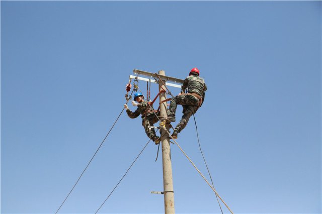 施工當(dāng)天烏海地區(qū)高溫來襲,施工難度陡增,六五四供電分局黨員突擊隊成員在三十五攝氏度的高溫下,頭頂烈日、腳踏電桿。按照分工干脆利落的進(jìn)行立桿、安裝橫擔(dān)、緊線等工作。經(jīng)過3個小時的作業(yè),終于順利地為此貧困戶送上電。貧困戶張占飛的母親非常激動。“原先以為只是簡單修一下,沒想到還需要這么多步驟,他們做得這么細(xì)致、這么認(rèn)真,真的是非常感謝他們。”