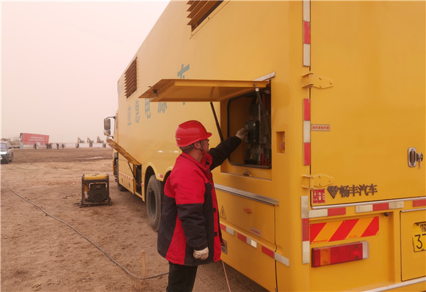 開工儀式當天沙塵天氣持續(xù),揚沙隨風彌漫,突擊隊的保電人員不辭辛苦一大早便提前進入會場。將發(fā)電車??吭谇捌诓榭钡闹付ㄎ恢茫龊冒踩O(jiān)護相關的工作之后,啟動車輛試運行,檢查了各項儀表數據,并做好與用戶側供電設備的對接,全力以赴投入保電工作。該分局領導帶領保電人員全程守候在現場,隨時應對突發(fā)停電事故的發(fā)生,確保了開工儀式用電萬無一失。