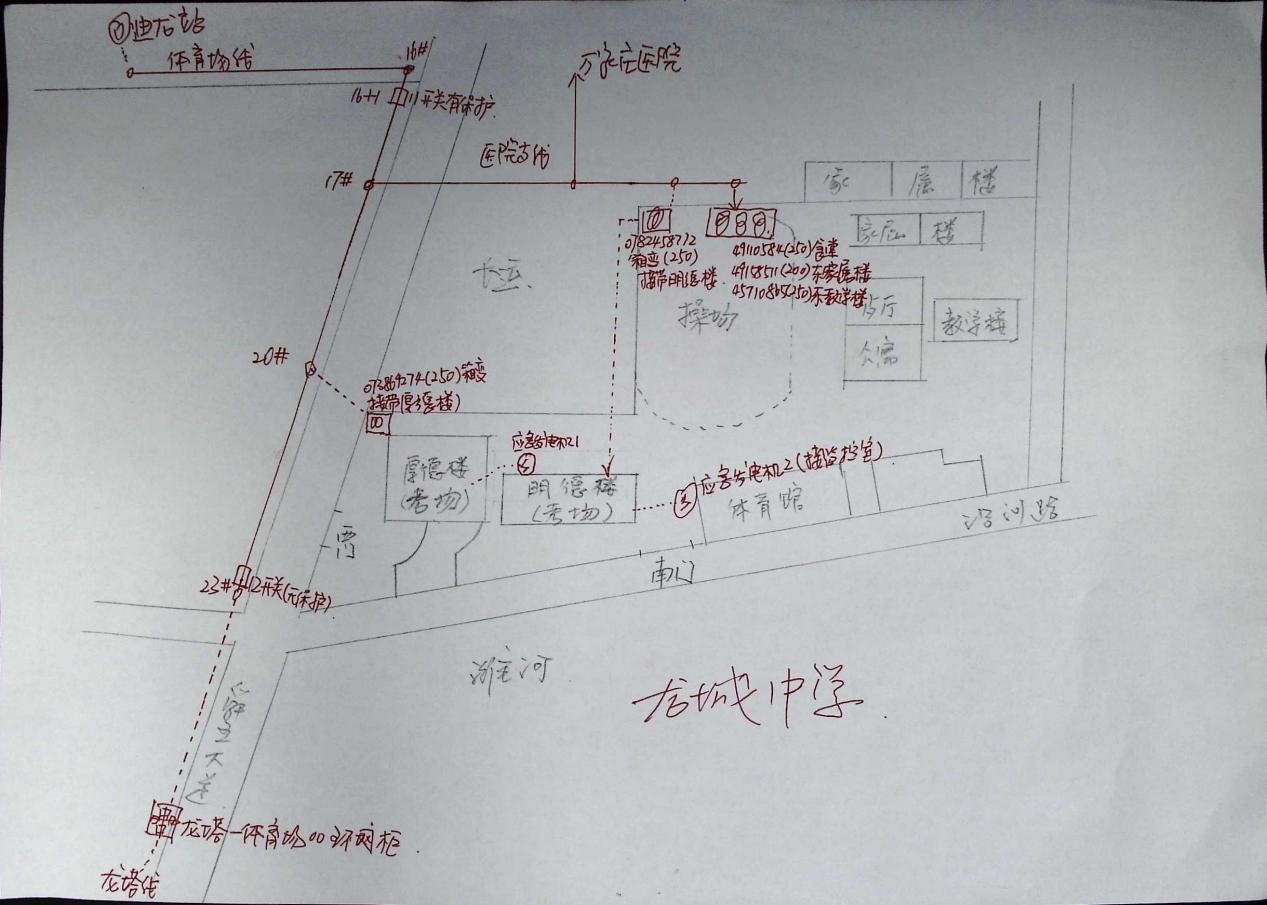 諸城市龍城中學建校于1998年,隨著學校的發(fā)展,校園規(guī)模逐步擴大,供電變壓器也越來越多,且較為分散。該用戶現(xiàn)有配變5臺、總容量1200千伏安,電源全部來自110千伏迪龍站10千伏體育場線。對此,該校用電出現(xiàn)了電源點單一、供電可靠性相對不高,配變數(shù)量多且分散的特殊情況。為了熟練掌握龍城中學供電基本情況,確保高考保供電萬無一失,該公司舜王供電所工作人員多次現(xiàn)場勘查,手工繪制了該校區(qū)的供電網(wǎng)絡平面圖。該圖簡要繪制了龍城中學的建筑平面布置圖,標明了考場等重要負荷位置;涵蓋了龍城中學高壓電源走向圖、線路結構和標明T接點位置;明確了用戶5臺配變的分布位置和供電區(qū)域;綜合考慮接入線路和噪音影響,明確了供電公司保供電應急發(fā)電機的安裝和接入位置等。