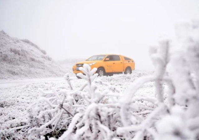 在貴州省黔東南州臺江縣紅陽坡頂上,一輛參加輸電線路巡視工作的車輛行駛在被鋪滿雪白雪花公路上