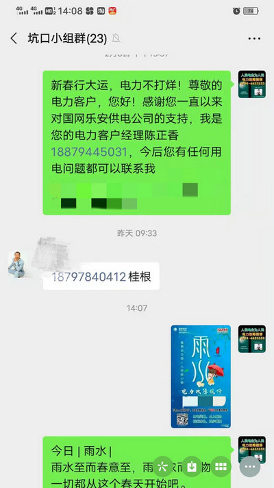 隨著智能通信時代的來臨,微信這一網(wǎng)絡軟件已成為人們重要的日常交流工具,通過微信群和客戶溝通交流,既省時省力,又方便快捷,有效地拉近了雙方的距離。為了更好地開展供電服務工作,樂安縣公司臺區(qū)客戶經(jīng)理早前就已經(jīng)自建或主動加入管理區(qū)域的村委、社區(qū)微信群,隨時將停電信息、線路搶修、電費回收、節(jié)約和安全用電知識等信息在群中公告和提醒。同時,客戶也可以通過微信群@客戶經(jīng)理,咨詢用電服務、了解供電信息、反映用電問題,在第一時間獲得供電服務。
