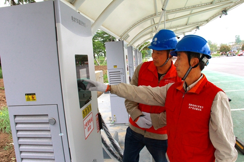 中國電力網(wǎng)訊 5月13日,江蘇連云港市東海縣供電公司駝峰供電所服務(wù)人員趙孫華、何文軍在縣開發(fā)區(qū)花卉市場門前檢查電動汽車充電樁運行情況。