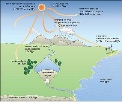 太陽直接照射在空氣、地表和海洋吸收47%(2.55百萬EJ/年)熱量