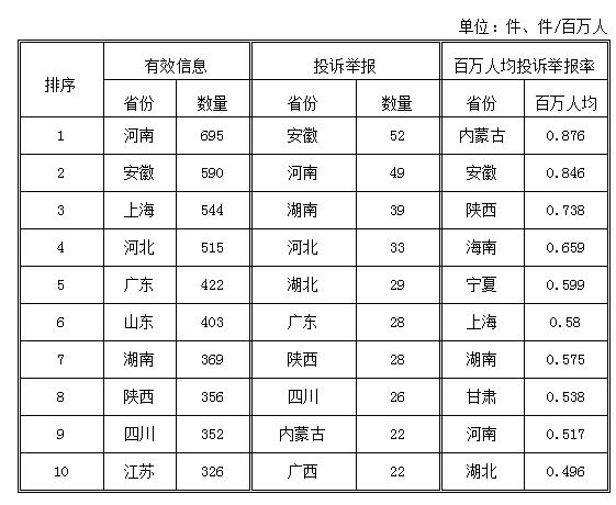 2018年1月,各省(自治區(qū)、直轄市)按照有效信息數(shù)量排序,河南、安徽、上海等?。ㄊ校┝腥珖?0位;按照投訴舉報(bào)數(shù)量排序,安徽、河南、湖南等省排在全國前10位;按照百萬人均投訴舉報(bào)率排序,內(nèi)蒙古、安徽、陜西等省(自治區(qū))位于全國前10位。(2018年1月有效信息及投訴舉報(bào)排名前10位情況見表三)