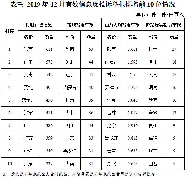 各?。ㄗ灾螀^(qū)、直轄市)按照收到的有效信息數(shù)量排序,陜西、山東、河南、河北、黑龍江等列全國前10位;按照投訴舉報數(shù)量排序,陜西、河北、遼寧、內(nèi)蒙古、甘肅等排在全國前10位;按照百萬人均投訴舉報數(shù)量排序,陜西,內(nèi)蒙古,甘肅,天津市,寧夏等排在全國前10位;按照辦結(jié)屬實投訴舉報數(shù)量排序,甘肅、四川、云南、河南、陜西等排在全國前10位。(2019年12月有效信息及投訴舉報排名前10位情況見表三)