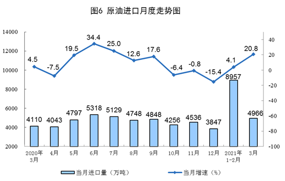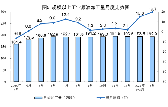 原油生產(chǎn)加快,加工量較快增長(zhǎng)。3月份,生產(chǎn)原油1709萬噸,同比增長(zhǎng)3.3%,比2019年3月份增長(zhǎng)3.3%,兩年平均增長(zhǎng)1.6%,日均產(chǎn)量55.1萬噸。加工原油5979萬噸,同比增長(zhǎng)19.7%,比2019年3月份增長(zhǎng)11.8%,兩年平均增長(zhǎng)5.8%,日均加工192.9萬噸。