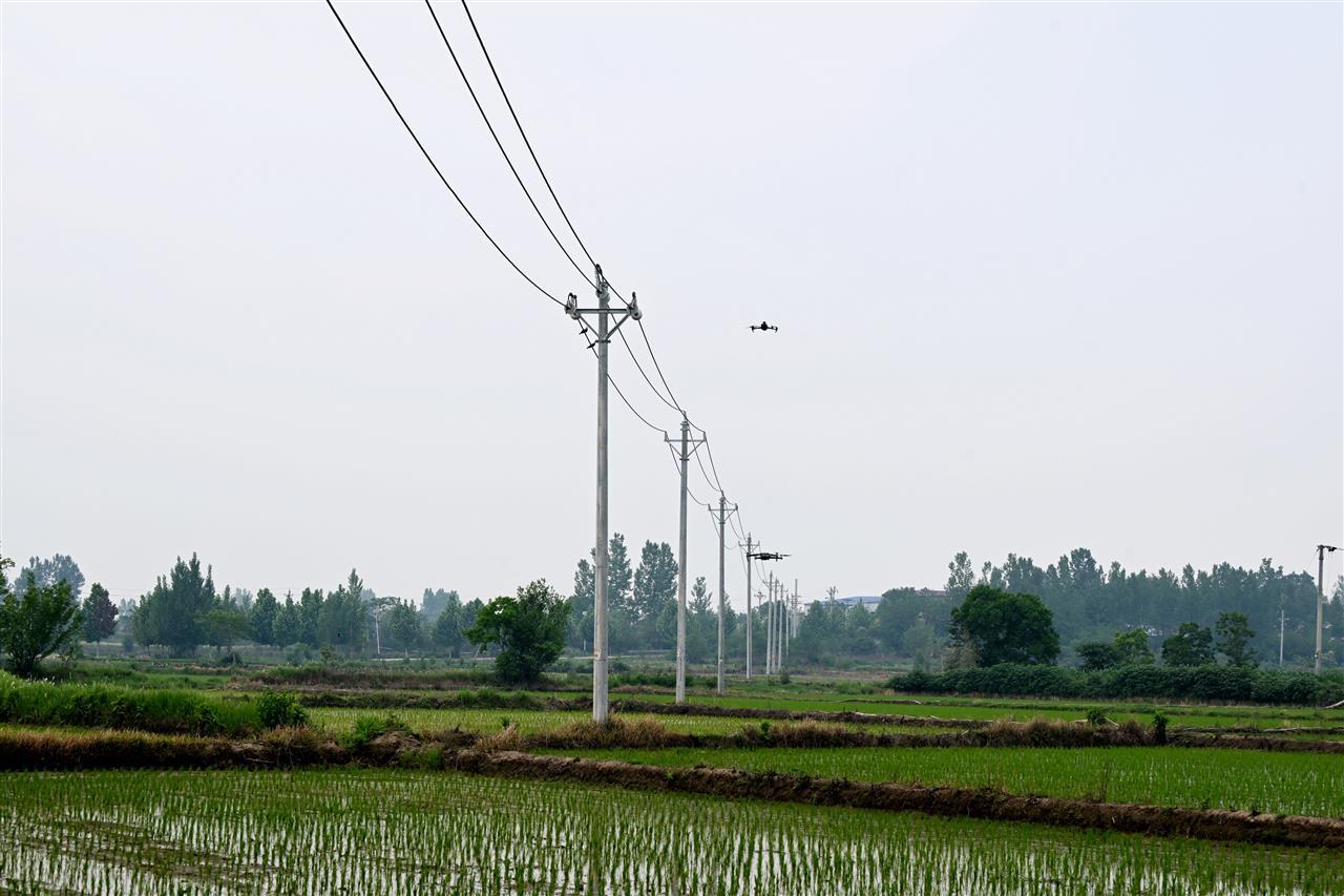 在湖北省安陸市木梓鎮(zhèn)10千伏江河線驗(yàn)收現(xiàn)場(chǎng),國(guó)網(wǎng)湖北電力利用無人機(jī)AI技術(shù)自主驗(yàn)收配電架空線路(余健兵、何瑤 攝)