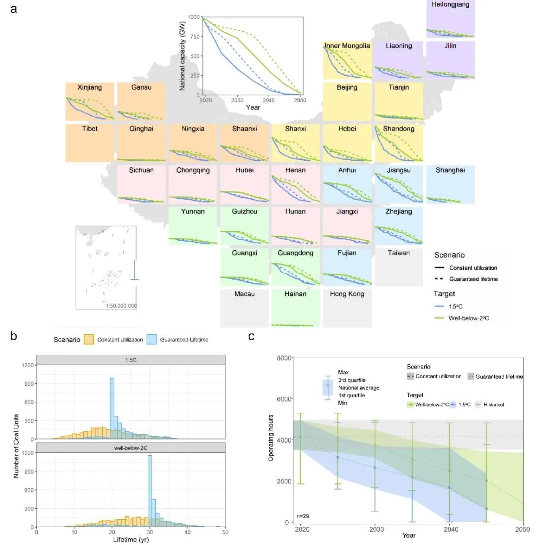為實(shí)現(xiàn)《巴黎協(xié)定》氣候目標(biāo),未來(lái)30年中國(guó)需要在燃煤發(fā)電行業(yè)實(shí)現(xiàn)深度減排,并達(dá)到凈零排放。近期發(fā)表于《自然-通訊》上的研究對(duì)中國(guó)實(shí)現(xiàn)氣候目標(biāo)和減排途徑的可行性展開(kāi)了分析,研究者們首先依據(jù)技術(shù)屬性、盈利能力、環(huán)境影響對(duì)中國(guó)1037個(gè)現(xiàn)役燃煤電廠的退役優(yōu)先級(jí)進(jìn)行逐一評(píng)估,并結(jié)合全球升溫1.5°C和2°C目標(biāo)情景,提出了可持續(xù)的中國(guó)燃煤電廠退出路徑選擇。研究發(fā)現(xiàn),為實(shí)現(xiàn)氣候目標(biāo),中國(guó)需要在短期內(nèi)停止新建燃煤電廠,優(yōu)先退役落后產(chǎn)能,可以通過(guò)降低利用小時(shí),保障大部分機(jī)組20年(1.5°C目標(biāo))或30年(2°C目標(biāo))的運(yùn)行年限,并在2045年(1.5°C目標(biāo))或2055年(2°C目標(biāo))前實(shí)現(xiàn)全面的煤電退出。