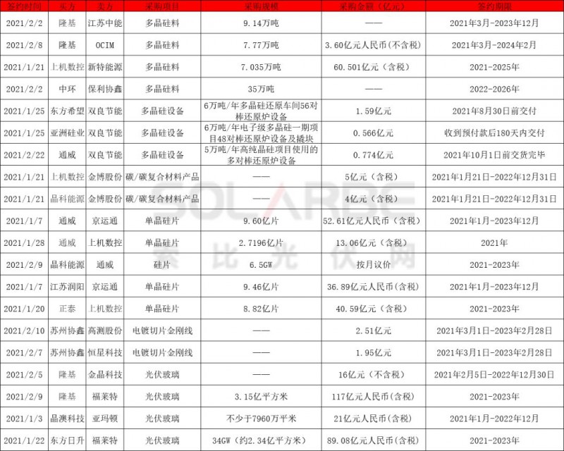 硅片方面,通威與京運通、上機數控累計簽訂單晶硅片訂單超12億片;晶科能源向通威采購硅片6.5GW;江蘇潤陽向京運通采購硅片9.46億片;正泰向上機數控采購單晶硅片8.82億片,以上合同采購期限均為2021-2023年。同時,蘇州協(xié)鑫與高測股份、恒星科技簽訂總價4.46億元的電鍍切片金剛線采購項目。