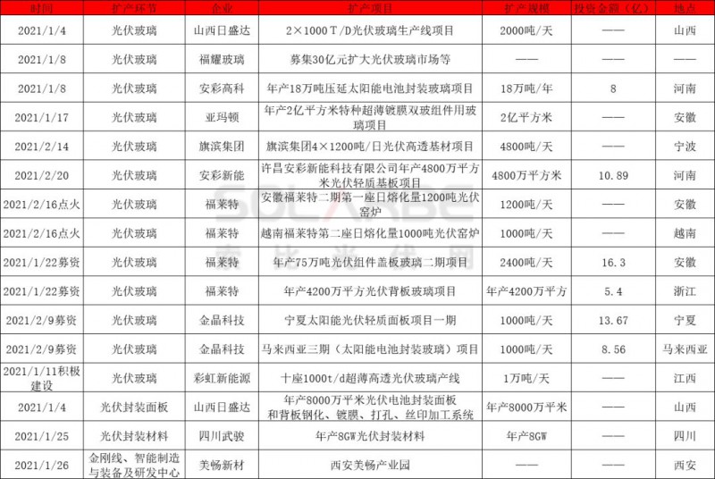自去年12月16日工信部宣布放開光伏玻璃擴產限制后,2021年開年至今,安彩高科、安彩新能、亞瑪頓紛紛加速光伏玻璃擴產。1月8日,安彩高科宣布與博愛凌創(chuàng)合資成立焦作安彩新材料有限公司,開展年產18萬噸壓延太陽能電池封裝玻璃項目建設。1月17日,亞瑪頓旗下鳳陽硅谷智能有限公司二期項目“年產2億平方米特種超薄鍍膜雙玻組件用玻璃項目”在滁州舉行開工儀式。2月20日,安彩新能年產4800萬平方米光伏輕質基板項目開工,項目投資10.89億,涵蓋1.8~4.0mm厚度光伏玻璃產品,支持超大規(guī)格電池組件。