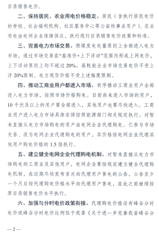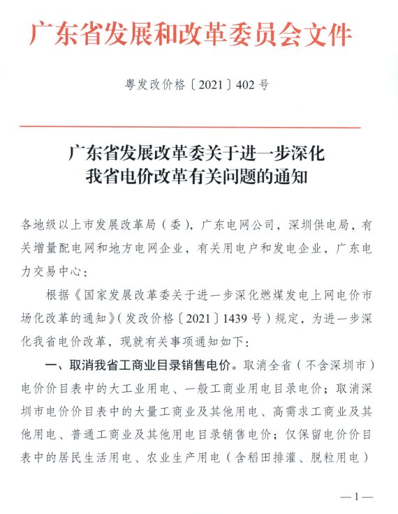 日前,廣東省發(fā)展改革委印發(fā)《關(guān)于進(jìn)一步深化我省電價(jià)改革有關(guān)問(wèn)題的通知》,通知明確,取消工商業(yè)目錄銷售電價(jià);保持居民、農(nóng)業(yè)用電價(jià)格穩(wěn)定; 完善電力市場(chǎng)交易;推動(dòng)工商業(yè)用戶都進(jìn)入市場(chǎng);建立健全電網(wǎng)企業(yè)代理購(gòu)電機(jī)制;加強(qiáng)與分時(shí)電價(jià)政策銜接。