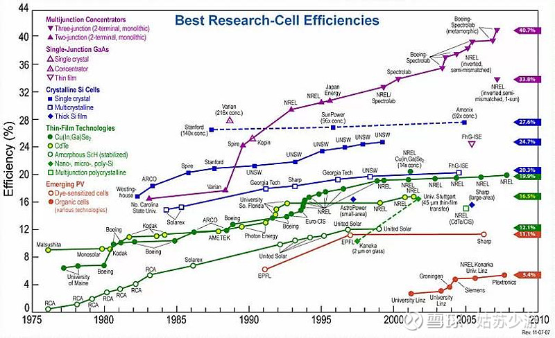 從十年前美國(guó)國(guó)家實(shí)驗(yàn)室的技術(shù)演進(jìn)圖來看,光伏的效率排序:異質(zhì)結(jié)(Multijunction)>單質(zhì)結(jié)(Single-junction)>多晶電池(Crystalline Si)>薄膜電池(Thin-film)。