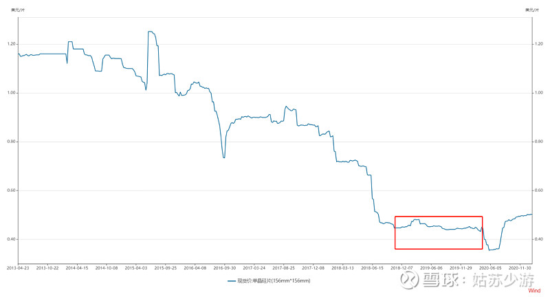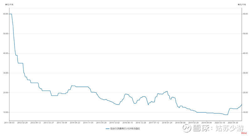 這是2011年至今的硅料價(jià)格,當(dāng)年保利協(xié)鑫的產(chǎn)能釋放完畢,硅料價(jià)格從100美元/kg跌到20美元/kg。