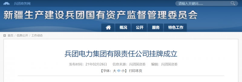 2月26日,從兵團(tuán)國(guó)資委獲悉,新疆生產(chǎn)建設(shè)兵團(tuán)電力集團(tuán)有限責(zé)任公司在烏魯木齊舉行揭牌儀式,宣布正式成立。兵團(tuán)電力集團(tuán)有限責(zé)任公司是兵團(tuán)國(guó)資國(guó)企改革中兵團(tuán)本級(jí)成立的第一個(gè)產(chǎn)業(yè)集團(tuán)公司,企業(yè)注冊(cè)資本金5億元,是新疆電力市場(chǎng)的重要主體和能源產(chǎn)業(yè)的新興力量。