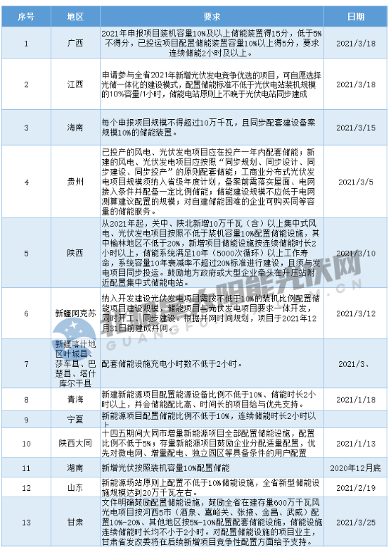 就消納掣肘,光伏電站配置儲能成為政策導向。據北極星太陽能光伏網統計,2021開年以來,廣西、江西、貴州、山東、海南等13個地區(qū)要求風、光項目強配儲能,比例在5%~10%之間,連續(xù)儲能在2小時及以上。然而在儲能經濟性仍未達到預期且獲利商業(yè)模式仍未明朗下,強配儲能對于光伏電站投資業(yè)主來說無疑是雪上加霜。
