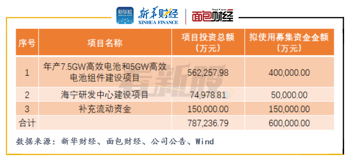 晶科能源此次擬公開發(fā)行不超過26.67億股,發(fā)行股份數(shù)量不超過發(fā)行后總股本的25%,擬募集60億元投向年產(chǎn)7.5GW高效電池和5GW高效電池組件建設(shè)項(xiàng)目(以下簡稱“高效電池及組件項(xiàng)目”)、海寧研發(fā)中心建設(shè)項(xiàng)目以及補(bǔ)充流動(dòng)資金。其中高效電池及組件項(xiàng)目擬使用募集資金金額為40億元,占此次擬募集資金總額的66.67%,是此次募資的主要投資項(xiàng)目。