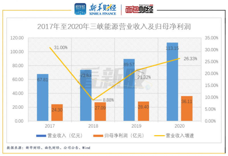 三峽能源主營業(yè)務(wù)為風(fēng)能、太陽能的開發(fā)、投資和運(yùn)營。2018年至2020年,公司實(shí)現(xiàn)營業(yè)收入分別為73.83億元、89.57億元、113.15億元,同比分別增加8.88%、21.32%、26.33%;實(shí)現(xiàn)歸母凈利潤分別為27.09億元、28.40億元、36.11億元,同比分別增加11.48%、4.84%、27.16%。