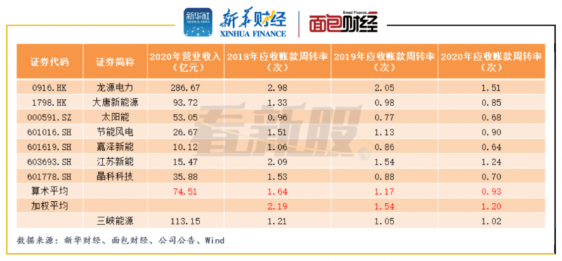 可以看出,2020年三峽能源的應(yīng)收賬款周轉(zhuǎn)率為1.02次,略高于可比公司平均水平,但是低于可比公司以當(dāng)期營業(yè)收入加權(quán)后的平均值,與龍?jiān)措娏?、江蘇新能應(yīng)收賬款周轉(zhuǎn)水平仍有較大差距,日后賒銷回款效率有待觀察。
