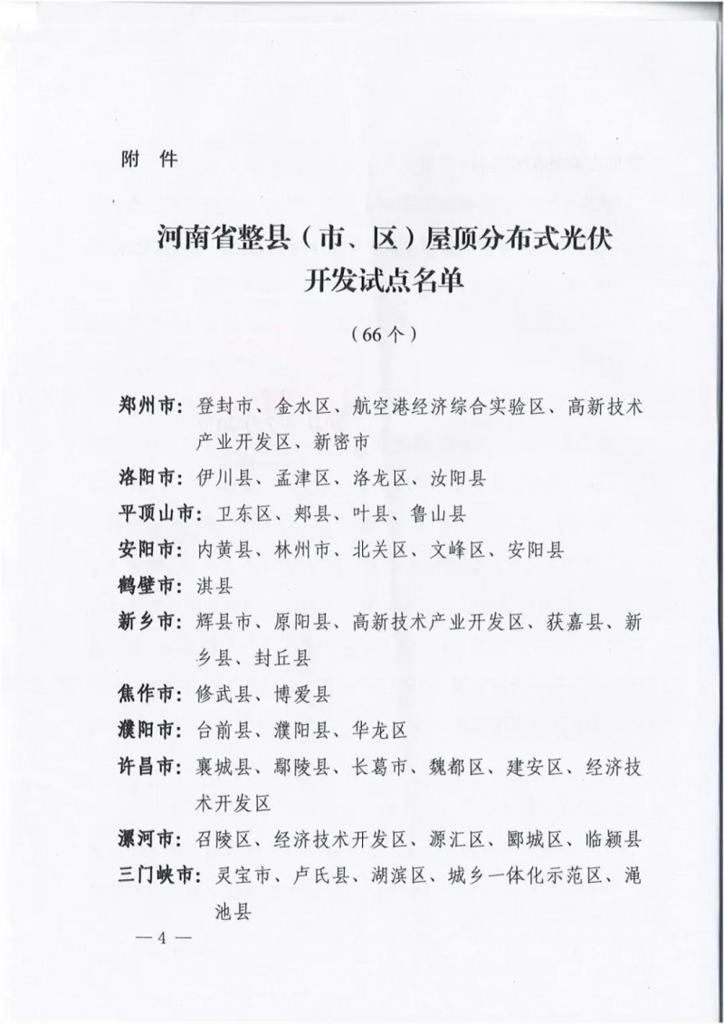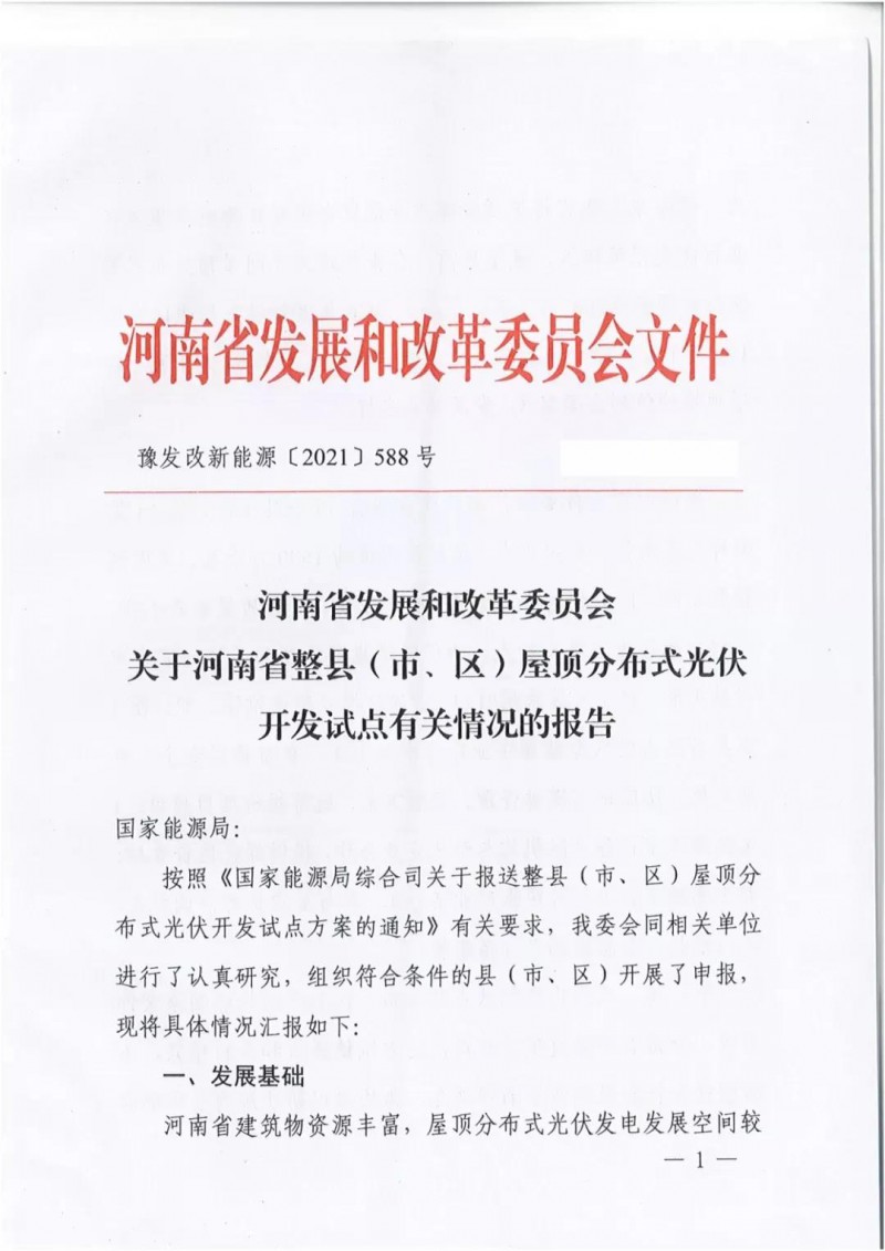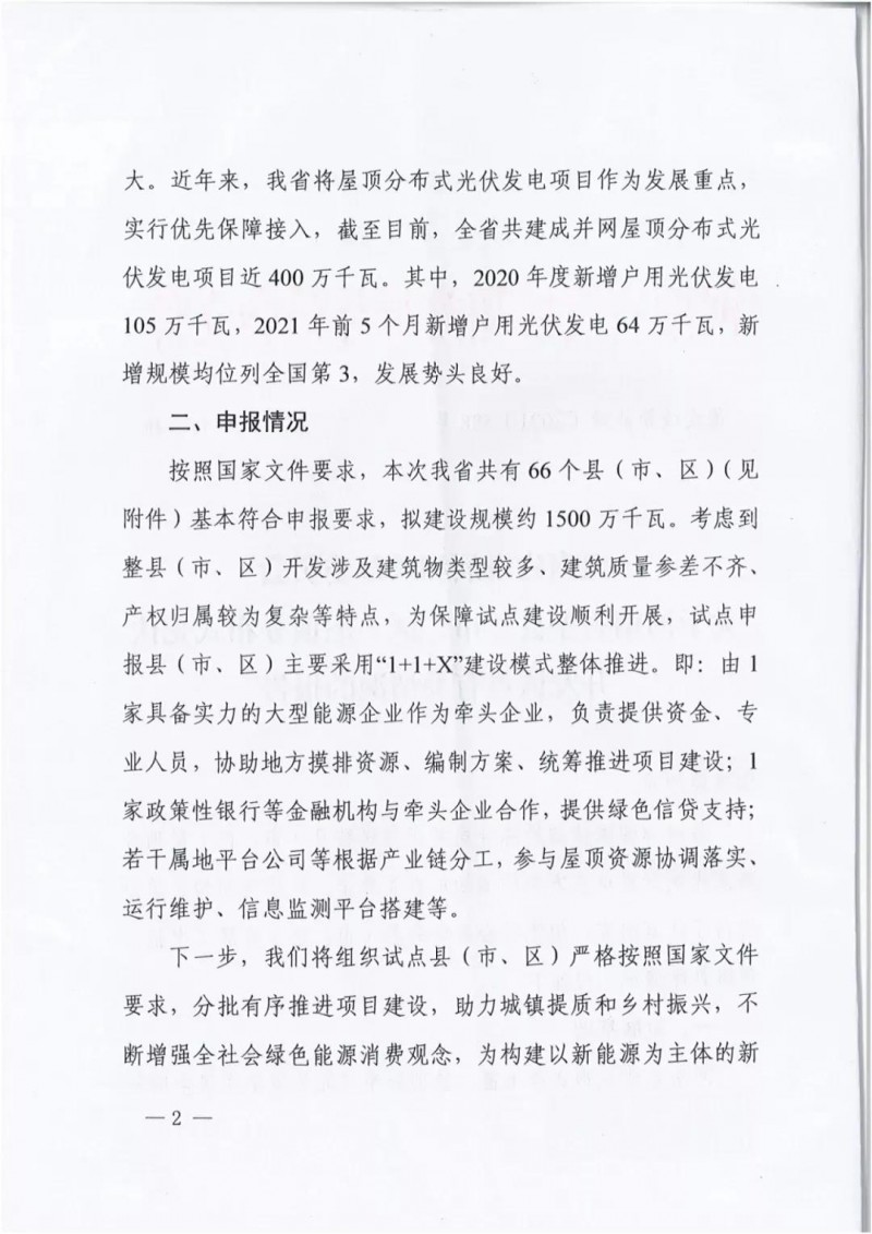 近日,河南發(fā)改委下發(fā)關(guān)于《關(guān)于河南省整縣(市、區(qū))屋頂分布式光伏開發(fā)試點(diǎn)有關(guān)情況的報(bào)告》,文件顯示,河南省共有66個(gè)省(市、區(qū))基本符合申報(bào)要求,擬建設(shè)規(guī)模約1500萬千瓦。文件指出,考慮到整縣(市、區(qū))開發(fā)涉及建筑物類型較多、建筑質(zhì)量參差不齊、產(chǎn)權(quán)歸屬較為復(fù)雜等特點(diǎn),為保障試點(diǎn)建設(shè)順利開展,試點(diǎn)申報(bào)縣(市、區(qū))主要采用“1+1+X”建設(shè)模式整體推進(jìn)。