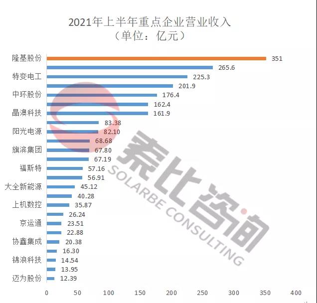 從營收來看,2021年上半年104家企業(yè)總營收3712億元,同比增長146%。光伏龍頭企業(yè)隆基股份以351億元的營業(yè)收入位居榜首,遙遙領先;通威股份、特變電工、天合光能、中環(huán)股份位居前五。
