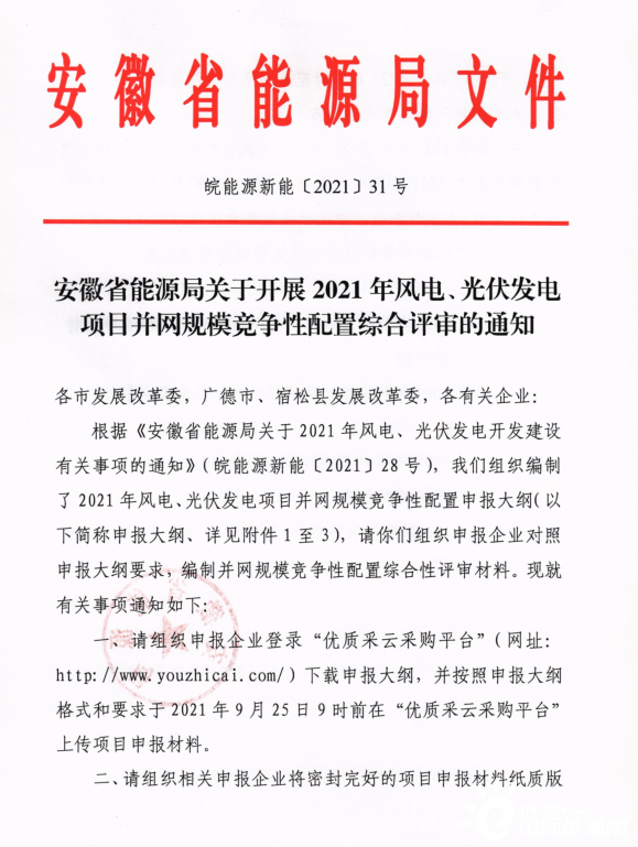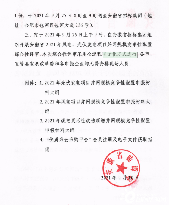 9月25日,安徽省招標(biāo)集團(tuán)將組織開展安徽省2021年風(fēng)電、光伏發(fā)電項(xiàng)目并網(wǎng)規(guī)模競爭性配置綜合性評審。評審工作全程采用電子化方式進(jìn)行,申報人員無需現(xiàn)場參與。