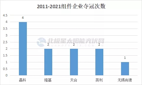2011-2021年全球光伏組件出貨量NO.1幾易其主,據(jù)北極星太陽(yáng)能光伏網(wǎng)梳理,晶科榮登寶座4次,天合奪冠2次,黑馬隆基于2020年超越晶科,奪得全球組件出貨第一的寶座,2021年大概率蟬聯(lián)冠軍。此外,無(wú)錫尚德登頂1次,英利登頂2次。