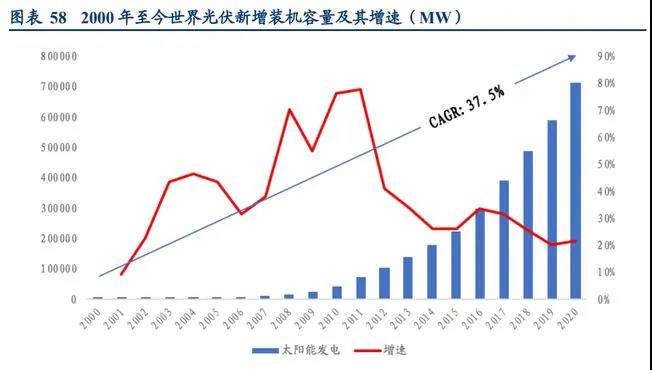 2014 年之后,光伏發(fā)電行業(yè)經(jīng)過優(yōu)勝劣汰的篩選,發(fā)電成本持續(xù)大幅下降,投資回報重 新獲得平衡,全球更多的國家加入到支持光伏發(fā)電的行列,具有技術研發(fā)優(yōu)勢、規(guī)模優(yōu)勢的企業(yè)涌現(xiàn)。縱觀歷史,近20年間光伏增速年均復合增長率達 37.5%。