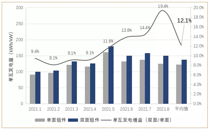 我們獲取了該項(xiàng)目從2021年1月到2021年8月共計(jì)8個(gè)月的發(fā)電數(shù)據(jù),為了評(píng)估項(xiàng)目的發(fā)電效果,選取了鄰近305Wp常規(guī)單晶組件的電站做參照。通過兩個(gè)電站各月單瓦發(fā)電量的對(duì)比,隆基雙面組件相比常規(guī)單晶組件每瓦發(fā)電量高12.1%。