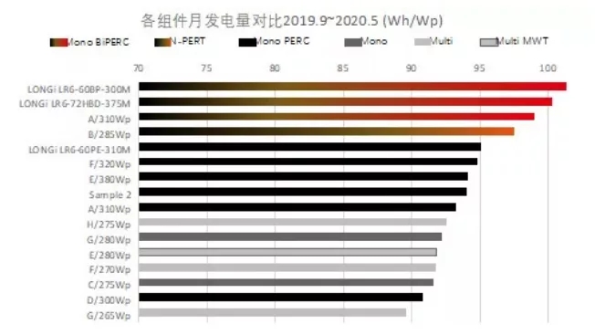 在德國PV Magazine雜志組織的“PV Magazine Test”組件戶外發(fā)電測(cè)試中,隆基雙面組件長(zhǎng)期位居發(fā)電量排行榜榜首,發(fā)電量顯著領(lǐng)先于眾多參評(píng)組件。