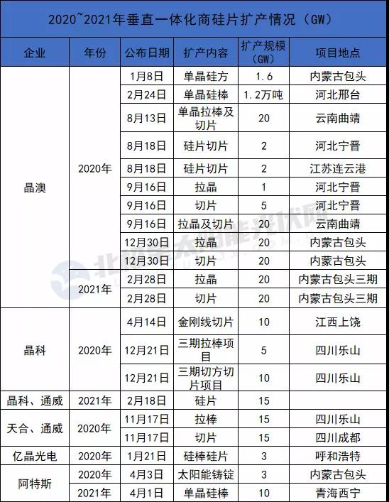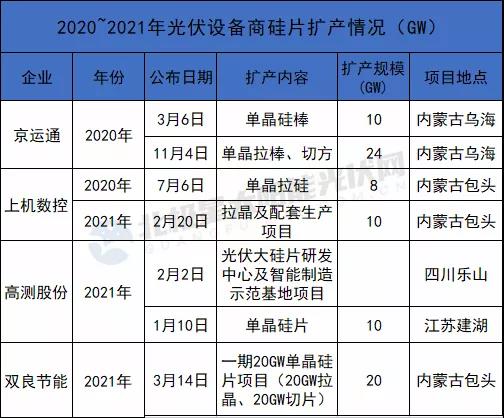 而2021年截至目前,隆基暫未公開(kāi)硅片相關(guān)擴(kuò)產(chǎn)計(jì)劃,2020年其在云南新擴(kuò)70GW單晶產(chǎn)能。
