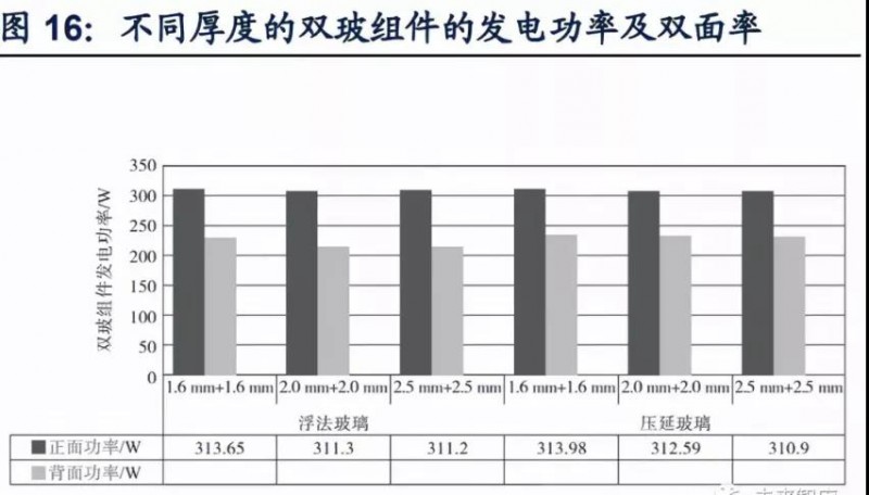 超白浮法玻璃力學(xué)性能更優(yōu),薄化后作為背板的發(fā)電功率接近超白壓延玻璃,陸續(xù)出現(xiàn)組件廠商采用超白浮法玻璃作為背板以降低成本。浮法玻璃表面平整度高,抗沖擊強度較壓延玻璃更為出色,并且隨著厚度降低,二者抗沖擊強度相差拉大,在1.6 mm浮法玻璃平均破碎高度高出超白壓延玻璃達97.77%。另外,雖然浮法玻璃透過率不如超白壓延玻璃,作為雙玻組件背板后會導(dǎo)致背面發(fā)電功率降低,但隨著厚度減小,二者發(fā)電功率差距逐漸降低,1.6mm雙玻組件下的背面發(fā)電功率相差僅為5.45W。浮法玻璃作為組件背板使用時,雙玻組件正面發(fā)電功率也可達到壓延玻璃作為背板時的發(fā)電功率。因此陸續(xù)有組件公司為降低生產(chǎn)成本,使用浮法玻璃作為背板。