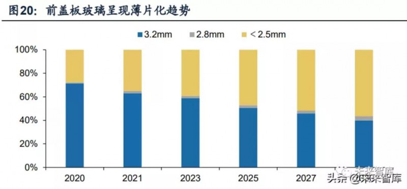 超薄光伏玻璃減少原片使用,助力降本同時順應(yīng)雙面組件輕量化需求,有望成為雙玻組件主流產(chǎn)品。超薄光伏玻璃節(jié)省原片使用量,價格相對傳統(tǒng)光伏玻璃更低,市場份額將伴隨雙玻組件滲透逐年提升。根據(jù)CPIA統(tǒng)計,2020年2.5mm及以下厚度的前蓋板玻璃市占率約為29%,2025/2030年有望提升至47%/56%。