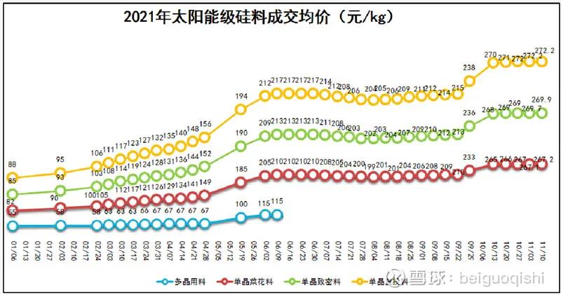光伏原材料多晶硅價格從年初的88元/kg(復投料),一路上漲至本周的272元/kg,上漲幅度之大超出了大多數(shù)人的預期。最近一個多月一直在272元/kg左右徘徊。