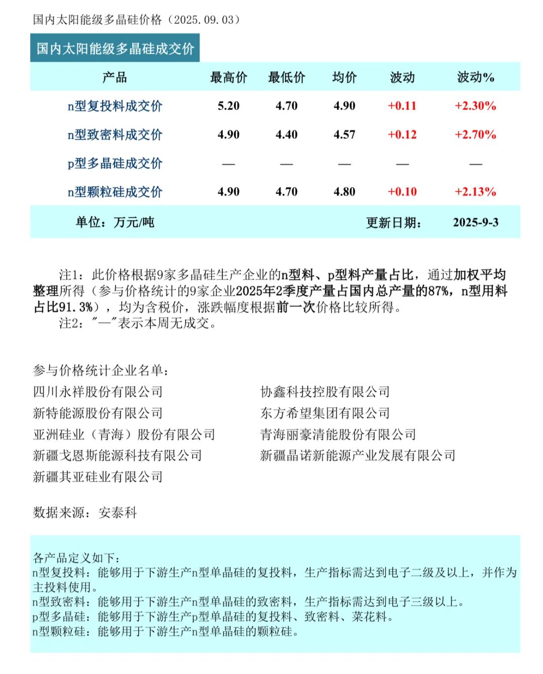 9月3日,中國(guó)有色金屬工業(yè)協(xié)會(huì)硅業(yè)分會(huì)發(fā)布本周多晶硅成交價(jià)格統(tǒng)計(jì)。n型復(fù)投料成交均價(jià)4.90萬元/噸,周環(huán)比上漲2.30%;n型致密料成交均價(jià)4.57萬元/噸,周環(huán)比上漲2.70%;n型顆粒硅成交均價(jià)4.80萬元/噸,周環(huán)比上漲2.13%。
