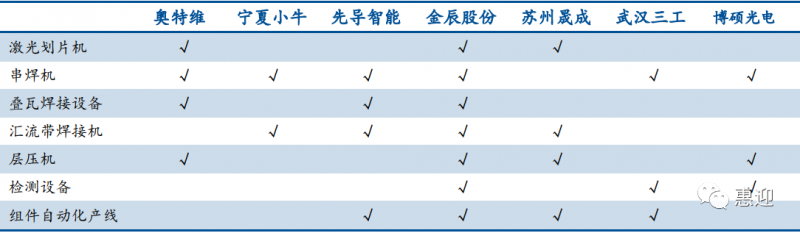 組件設(shè)備的市場較為分散,公司數(shù)量較多,競爭較為充分。組件設(shè)備國產(chǎn)化進(jìn)程較早,廠商可提供多種產(chǎn)品,充分利用技術(shù)同源和客戶同源優(yōu)勢。如奧特維可提供激光劃片機(jī)、串焊機(jī)、疊瓦串焊機(jī)、層壓機(jī)等設(shè)備,先導(dǎo)智能可提供串焊機(jī)、疊瓦一體焊接機(jī)、匯流條焊接機(jī)等設(shè)備,金辰股份可提供激光劃片機(jī)、串焊機(jī)、疊片焊接機(jī)、層壓機(jī)、匯流條焊接機(jī)、層壓機(jī)、EL 測試儀等設(shè)備。同時,先導(dǎo)智能、金辰股份、蘇州晟成、武漢三工還可提供組件自動化生產(chǎn)線。