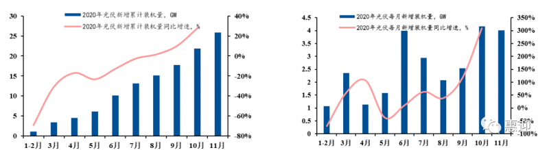 2020 年,我國新增光伏裝機(jī)量為 48.2GW,同比增長 81.7%,超過年內(nèi)各機(jī)構(gòu)預(yù)期。根據(jù)中電聯(lián)的數(shù)據(jù),我國光伏新增裝機(jī)量已在 2020 年下半年走出疫情的影響,光伏裝機(jī)量從 8 月份恢復(fù)至 19 年同期水平,10 月份新增的累計裝機(jī)量同比已實現(xiàn) 20%正增長,單月新增裝機(jī)規(guī)模超過 4GW,同比增長率高達(dá)300%。