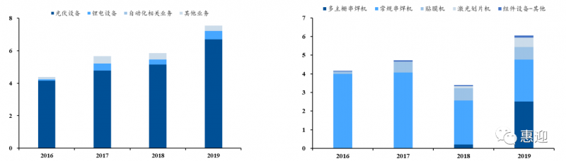 多主柵串焊機(jī)逐步成為公司光伏設(shè)備中的主要構(gòu)成產(chǎn)品。2018 年,公司多主柵串焊機(jī)開始放量,在公司光伏設(shè)備收入中占比約為 5.88%,2019 年,公司多主柵串焊機(jī)收入從 0.2 億元提升至 2.52 億元,占光伏設(shè)備收入中的 40.91%,超越常規(guī)串焊機(jī),成為公司光伏設(shè)備業(yè)務(wù)中占比最高的業(yè)務(wù),成為公司的營業(yè)收入中占比最高的業(yè)務(wù)。未來,公司的串焊機(jī)有望深度受益于光伏組件技術(shù)迭代,在新一輪市場擴(kuò)展中占據(jù)優(yōu)勢地位。